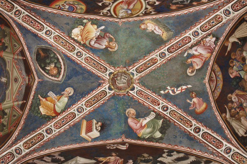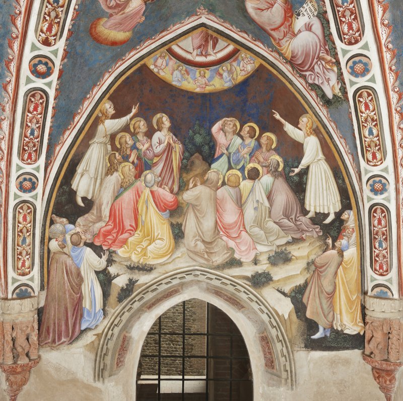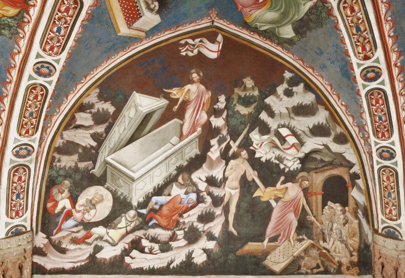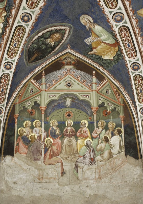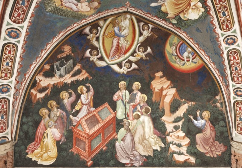 Sulle lunette delle quattro pareti sono raffigurate: la Pentecoste (a ovest, parete della porta d’ingresso); la Resurrezione di Cristo e la sua Discesa al Limbo (parete nord); l’Ascensione (est) e l’Assunzione in cielo della Vergine e il dono della fascia con cui era cinto il suo corpo all’apostolo Tommaso (parete sud). Tali episodi, successivi alla morte di Cristo, sono da porre in relazione con le immagini della vela stellata sovrastane.