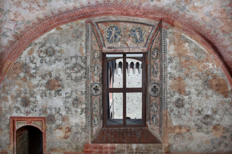 Nella sala si apre una grande finestra affrescata con decorazioni vegetali che attorniano, nella strombatura superiore, due putti contrapposti ed armati di spada, probabile allusione al nome dei Contrari, mentre negli stipiti altri putti sembrano muoversi nel vuoto volteggiando con graziosa ironia.