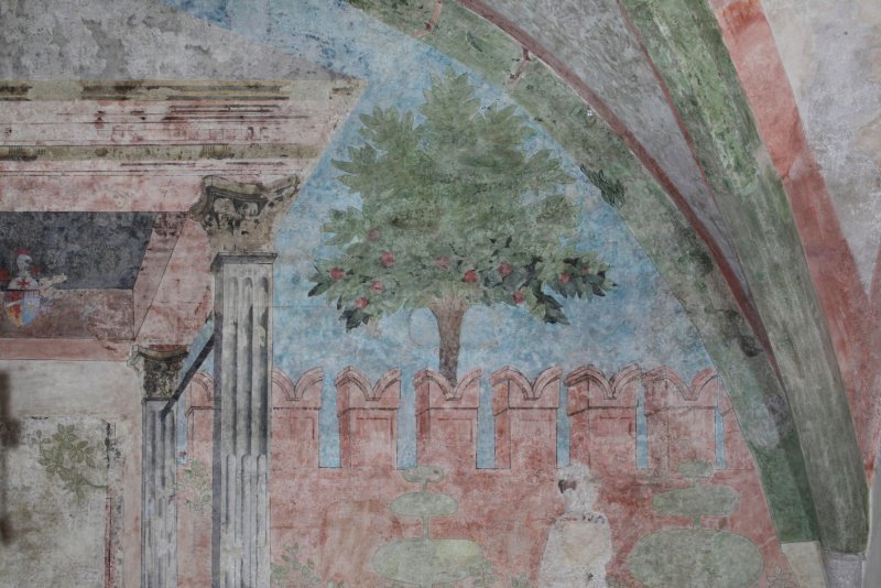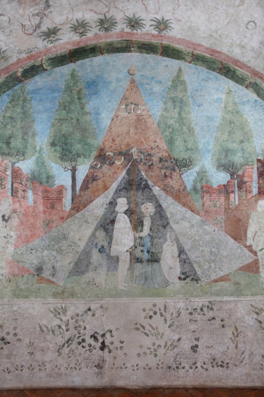 Sulla parete volta a nord è rappresentato l’evento principale, il matrimonio tra Ambrogio Contrari e Battistina Campofregoso celebratosi nel 1461. Sotto un grande padiglione di tessuto a lembi sollevati, si scorgono gli sposi affiancati da due paggi di cui sono rimasti solo profili evanescenti che li trasformano in presenze fantasmatiche. Nella raffinata scenografia appaiono le mura merlate che definiscono lo spazio della rappresentazione anche sulle restanti pareti, oltre le quali svettano piante d’alto fusto. Con tutta probabilità si tratta della riproduzione del giardino pensile della Rocca, collegato alla Rocchetta da un ponticello coperto a doppia arcata. L’hortus conclusus contiene un tempietto rinascimentale (parete ad est) all’interno del quale è raffigurato uno stemma dipinto nel Seicento, appartenente a Marcantonio Stradella, governatore di Vignola e padre di Alessandro, uno dei principali musicisti della seconda metà del XVII secolo.